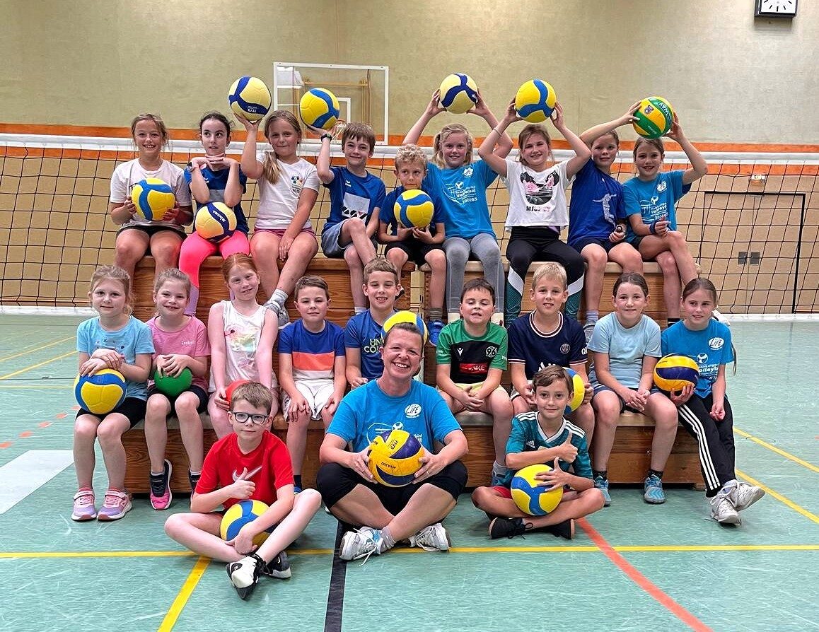 Jeden Mittwoch erlernen mittlerweile 18 Jungen und Mädchen im Alter von 10-12 Jahren gemeinsam neue Volleyballgrundtechniken und entwickeln immer mehr Fertigkeiten im Umgang mit dem Volleyball. Aber auch Teamwettkämpfe, Kraftübungen und Geschicklichkeitsspiele kommen nicht zu kurz. Viele von ihnen werden ab Oktober an der Volleyball-Mini-Liga des NWVV (Nordwestdeutscher Volleyballverband) am Wettkampfbetrieb teilnehmen. Einige werden sogar schon ihre zweite Saison mitspielen und können den Neuen sicherlich ihre Erfahrungen weitertragen.